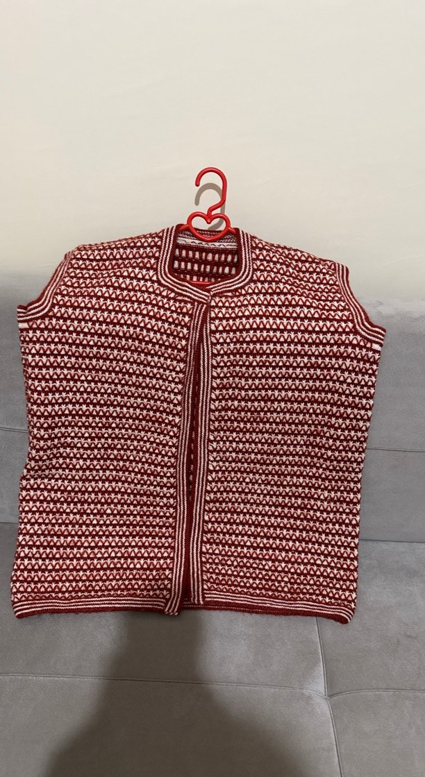 Kırmızı ve gri tonlarda, örgü dokulu, kolsuz, normal boyda ve bisiklet yaka kadın yelek. Günlük kullanıma uygun, rahat kesim.
