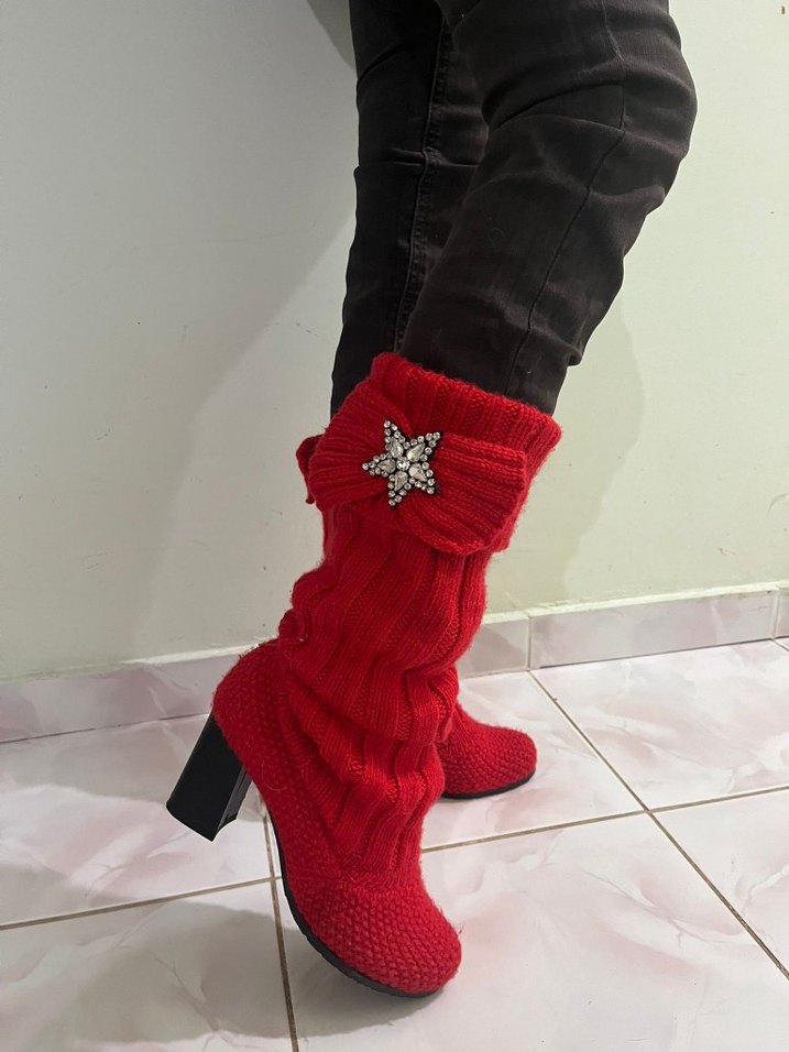 Tarzınızı kış aylarında da ön plana çıkarın! El örgüsü görünümlü kırmızı triko topuklu çizme, hem zarif hem sıcak bir duruş sunar. Kalın topuk yapısı sayesinde uzun süreli kullanımlarda bile konfor sağlar. Üzerindeki ışıltılı taş detaylı yıldız broş, çizmeye zarafet ve özgün bir dokunuş katar.
