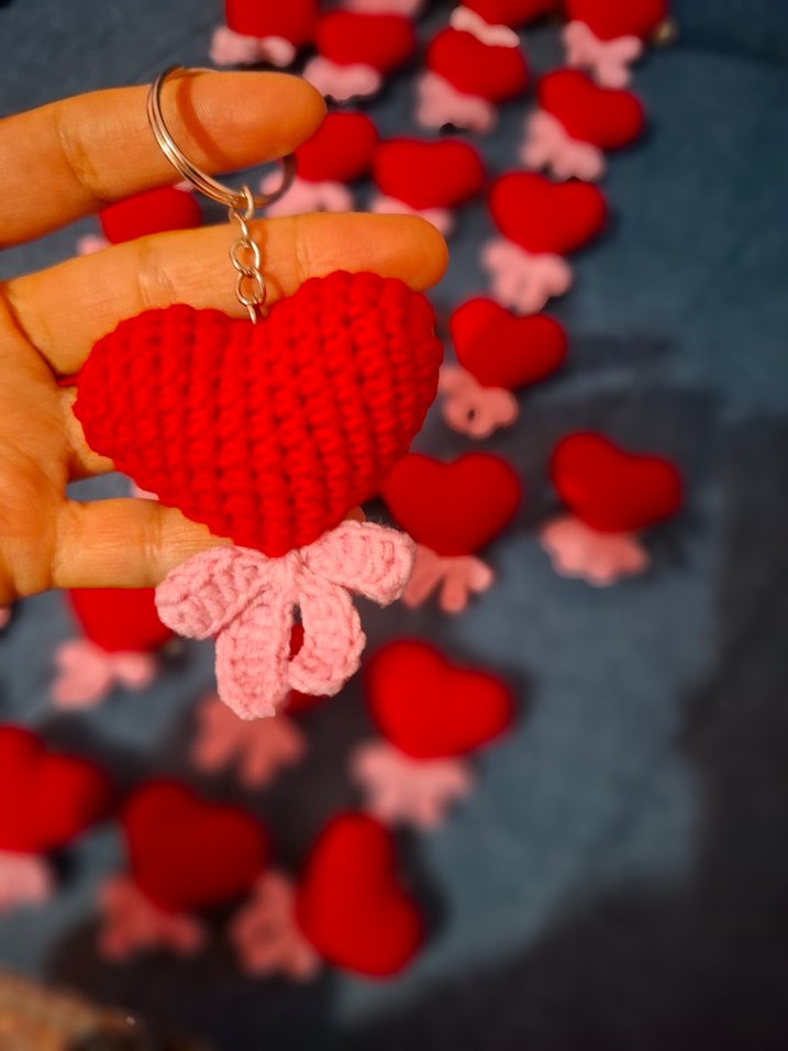 Kırmızı örgü kalp şeklinde, pembe fiyonk detaylı, renkli ve rahat bohem tarzda anahtarlık. ❤️