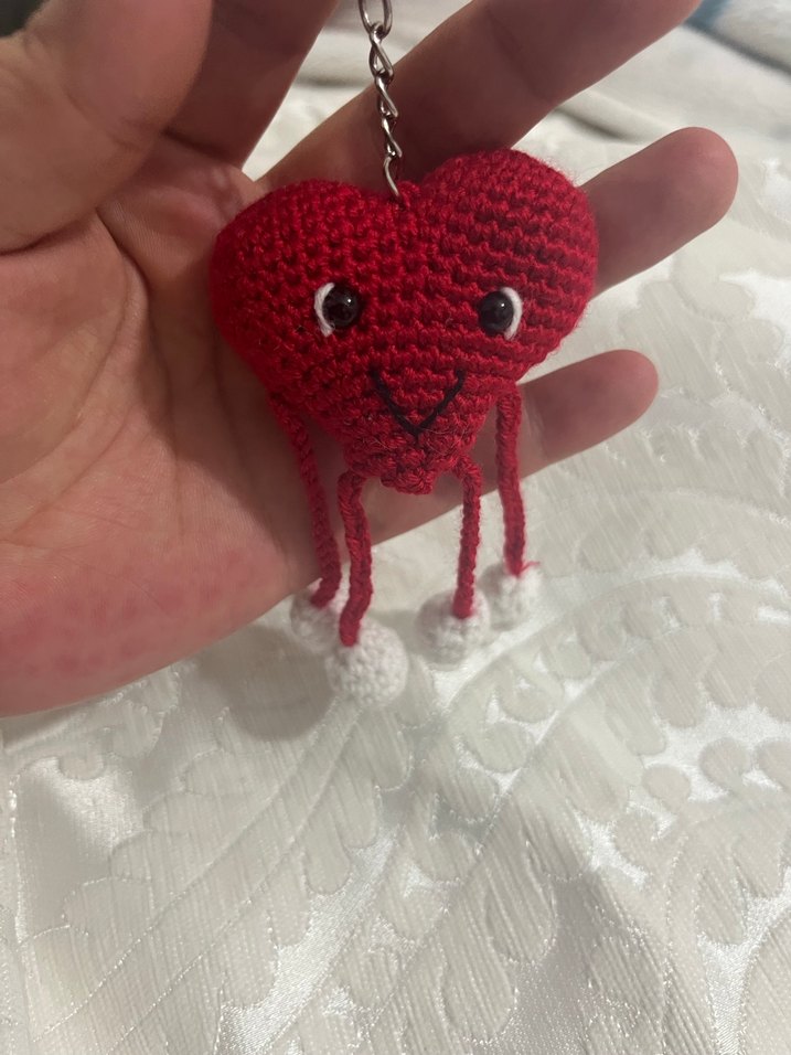 Renkli kırmızı örgü kalp şeklinde anahtarlık, sallanan bacakları ve dikkat çekici gözleriyle cesur goth tarzını yansıtıyor.