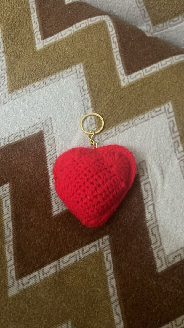 Renkli, bohem tarzda, kırmızı örgü kalp figürlü anahtarlık, anahtarlarınıza sıcak ve retro bir dokunuş katar. ❤️