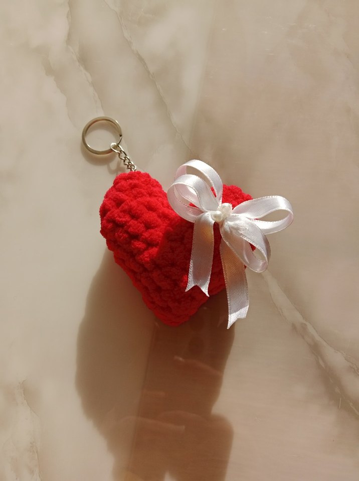 Beyaz saten fiyonkla süslenmiş, kırmızı örgü kalp anahtarlık, anahtarlarınıza bohem bir dokunuş katıyor. ❤️