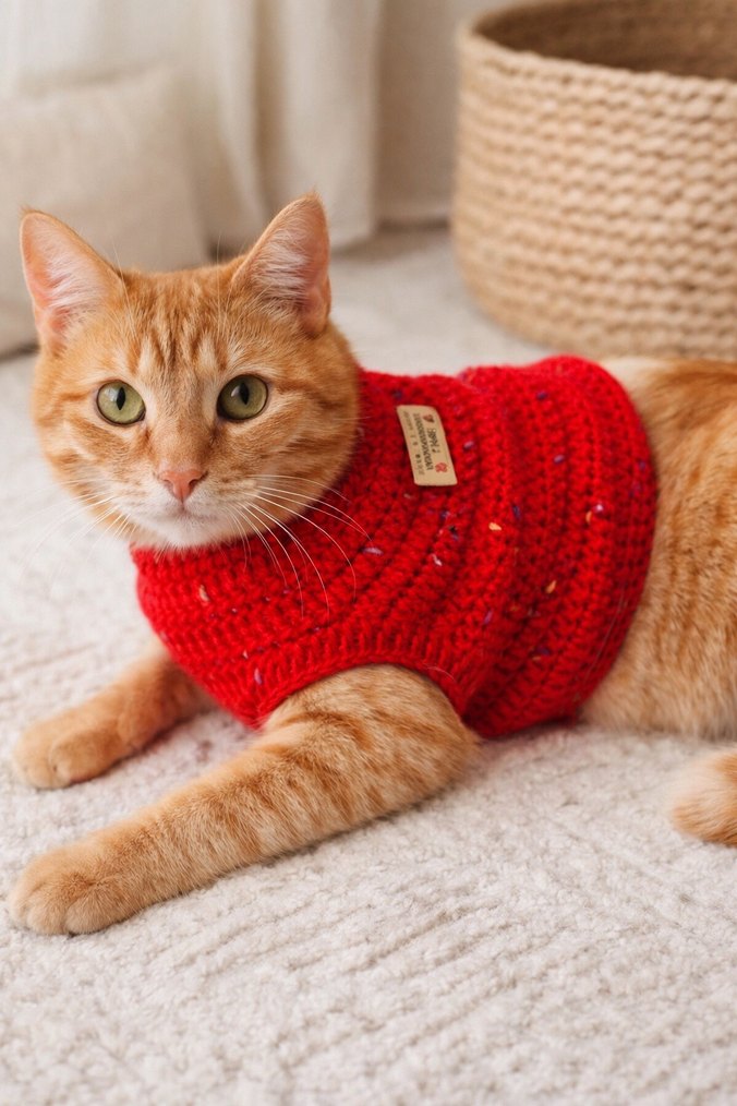 Renkli kırmızı örgü kedi süveteri, yumuşak dokusuyla sıcaklık ve rahatlık sağlar. Kediniz için konforlu bir uyum sunar. ürün S bedendir