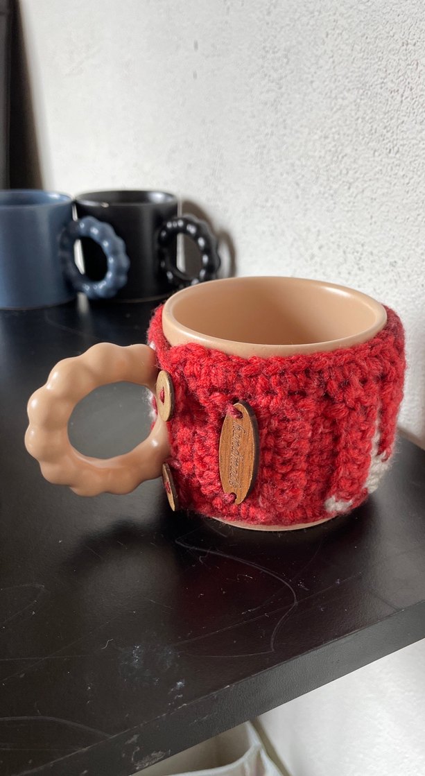 Kırmızı örgü kılıf ve ahşap düğmelerle süslenmiş, özel tasarımlı kulplu seramik kupa. ☕