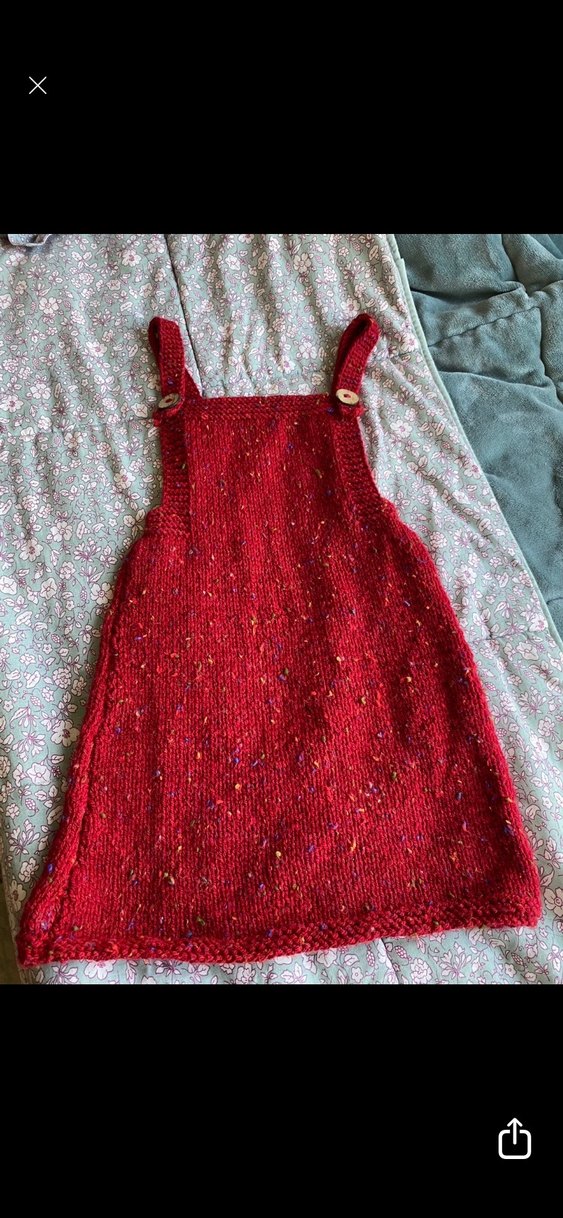 Kırmızı renkli, düğmeli askılı, straplez yakalı ve bol kesim örgü kız çocuk elbisesi. Bohem tarzına uygundur. 4.5 yaşa uygun