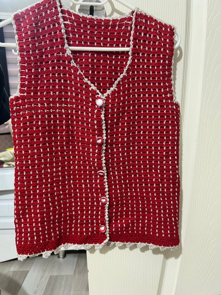 Kırmızı parlak renkte, V yakalı, örme kumaştan, kolsuz ve normal midi uzunlukta, beyaz detaylı düğmeli ve kenarları işlemeli, bohem tarzda rahat kesim kız çocuk yelek. 6-7 yaşa uygun sorunsuz