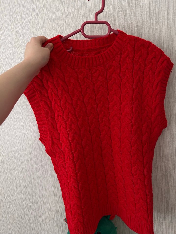 Kırmızı renkli, kolsuz ve örgü dokulu bu süveter, fitted kesim ve yuvarlak yaka ile rahat bir görünüm sunar. Günlük kullanıma uygun, renkli ve sokak modası tarzında bir parçadır.