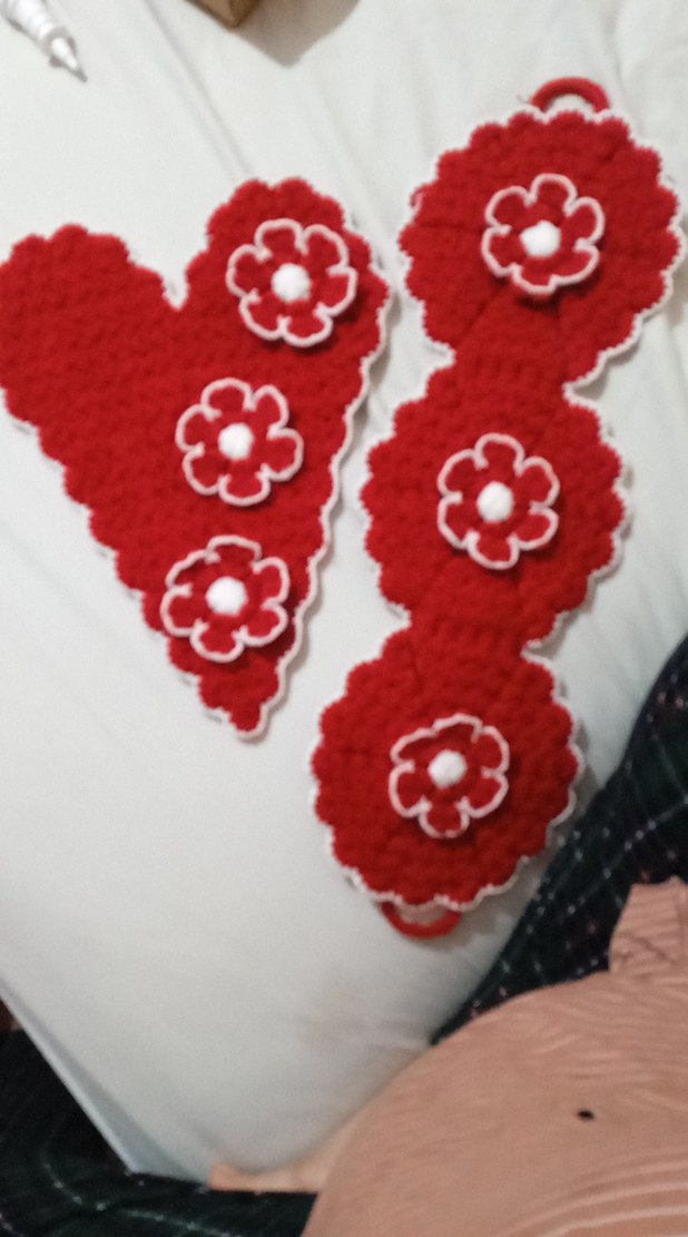 Kırmızı örgü lif, beyaz kenarlı çiçek detaylarıyla bohem ve renkli bir tarz sunar.