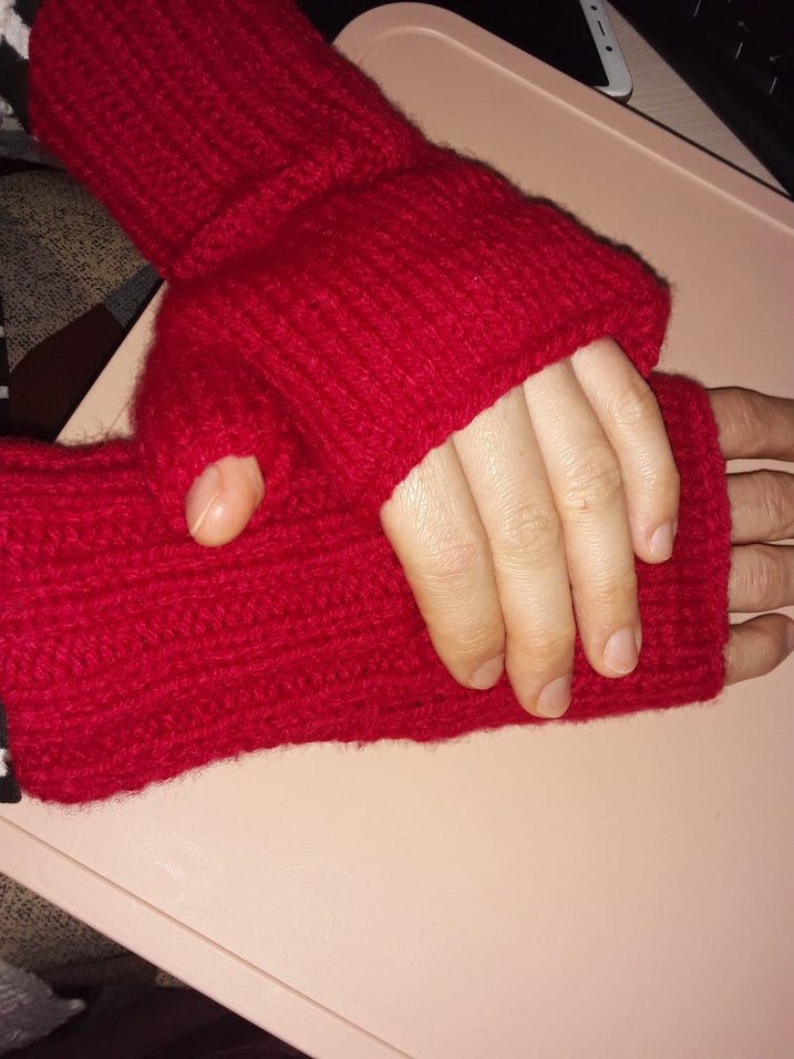Kırmızı örgü, parmaksız kadın eldiveni bohem tarzda, renkli ve rahat bir görünüm sunar. Parmak hareketine izin verir.