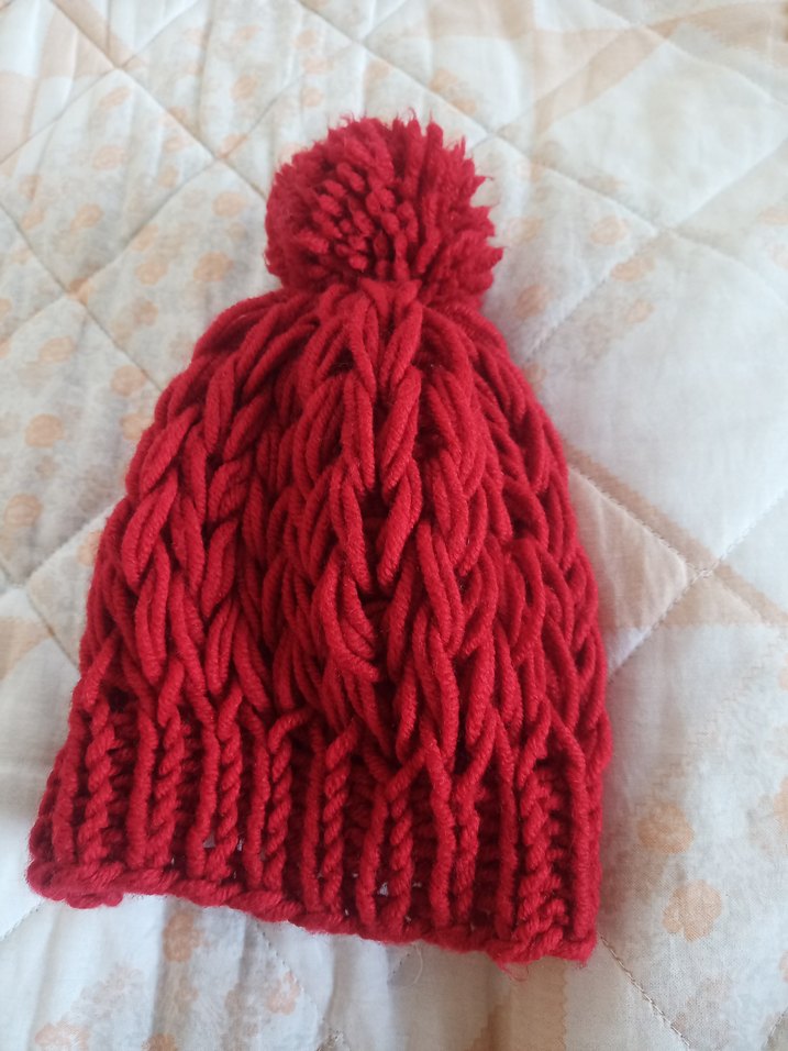 Kırmızı el örgüsü,ponponlu ve bohem tarzda rahat bir kadın bere. kullanılmamıştır.
