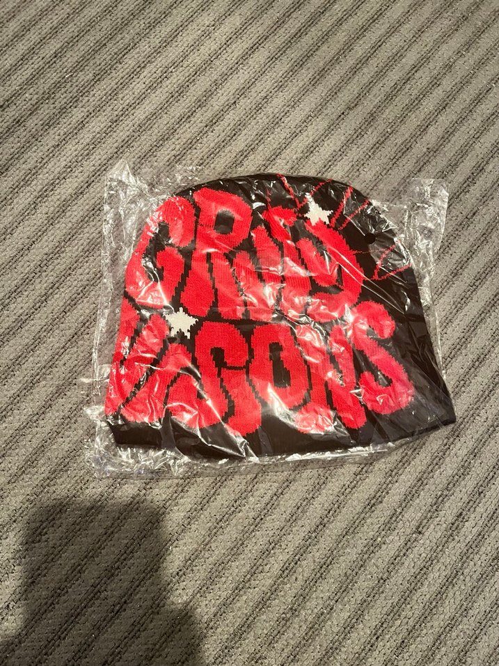 Kırmızı örgü kadın bere, grunge punk yazılı ve rock punk tarzı yansıtıyor. Plastik detaylı, counterculture modasına uygun.