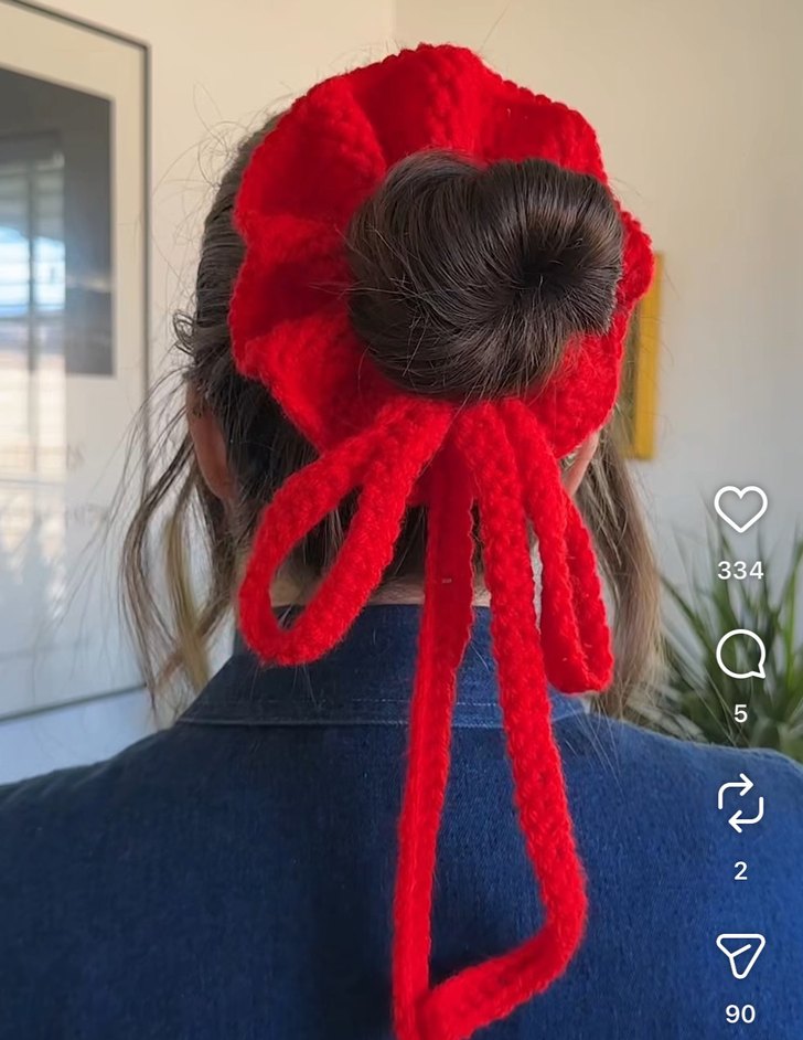 Kırmızı örgüden yapılmış, uzun bağcıkları olan renkli ve rahat bir saç aksesuarı. Moda ve avangart tarzlar için uygun.