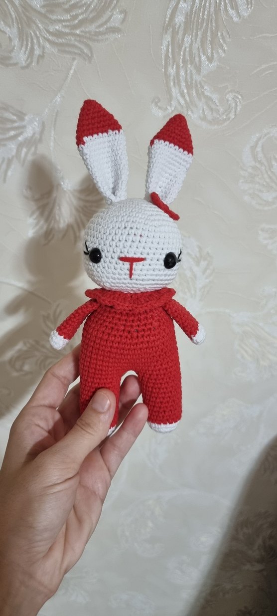 Renkli peluş oyuncak, kırmızı ve beyaz örgüden yapılmış, siyah gözlü ve kulakında küçük fiyonk bulunan tavşan.