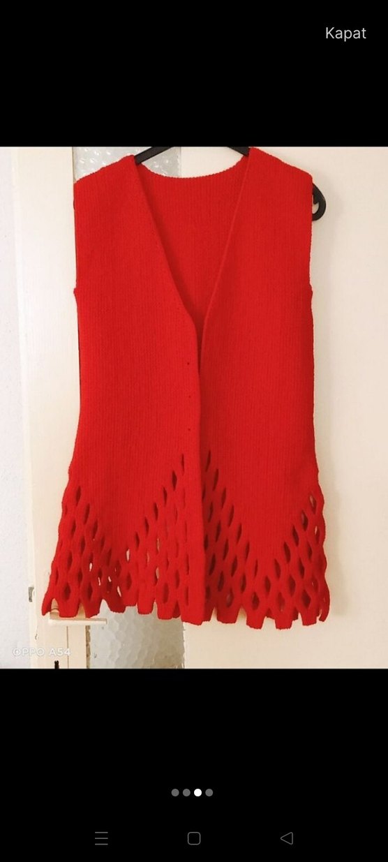 Kırmızı örgü, kolsuz ve V yakalı bu kadın yeleği, alt kısmında özgün delikli desenlere sahip, bohem tarzda rahat bir seçenektir.