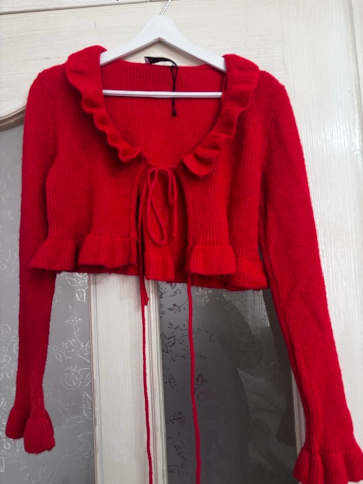 Kırmızı, uzun kollu, V yakalı ve fırfırlı detaylı örgü kadın kazak, rahat ve bohem tarzda günlük kullanıma uygundur. Üründe hiçbir sorun yok sadece ben giymiyorum