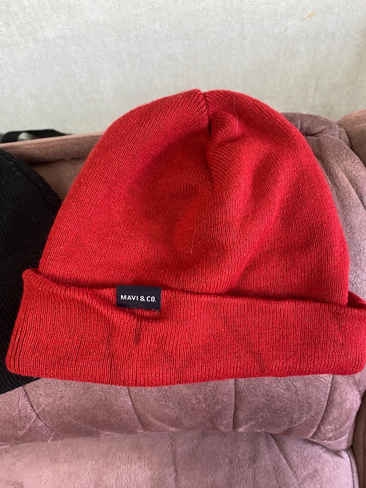 Kırmızı örgü yünden yapılmış, rahat sokak stili kadın bere. Üzerinde 'MAVI&.CO' etiketi bulunur. Kırmızı olan yeni diğeri kullanılmış