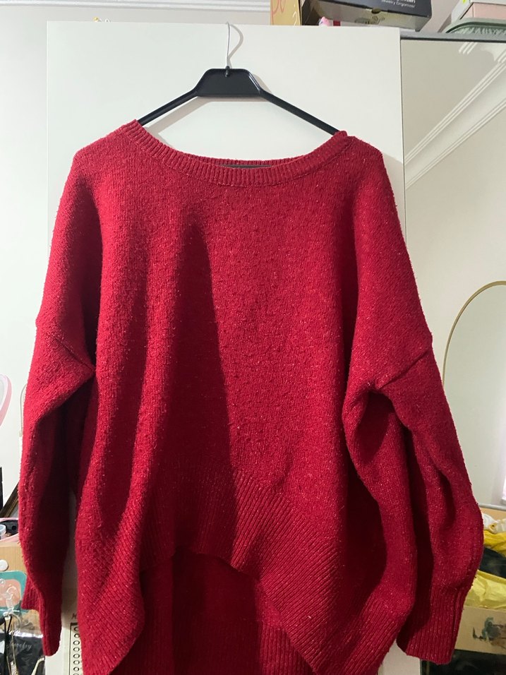 Kırmızı örgü yün kazak, bol kesim, uzun kollu ve yuvarlak yaka detaylarına sahiptir. Parlak ve sade rengiyle günlük kullanıma uygundur. Tüylenmiştir jiletle geçer