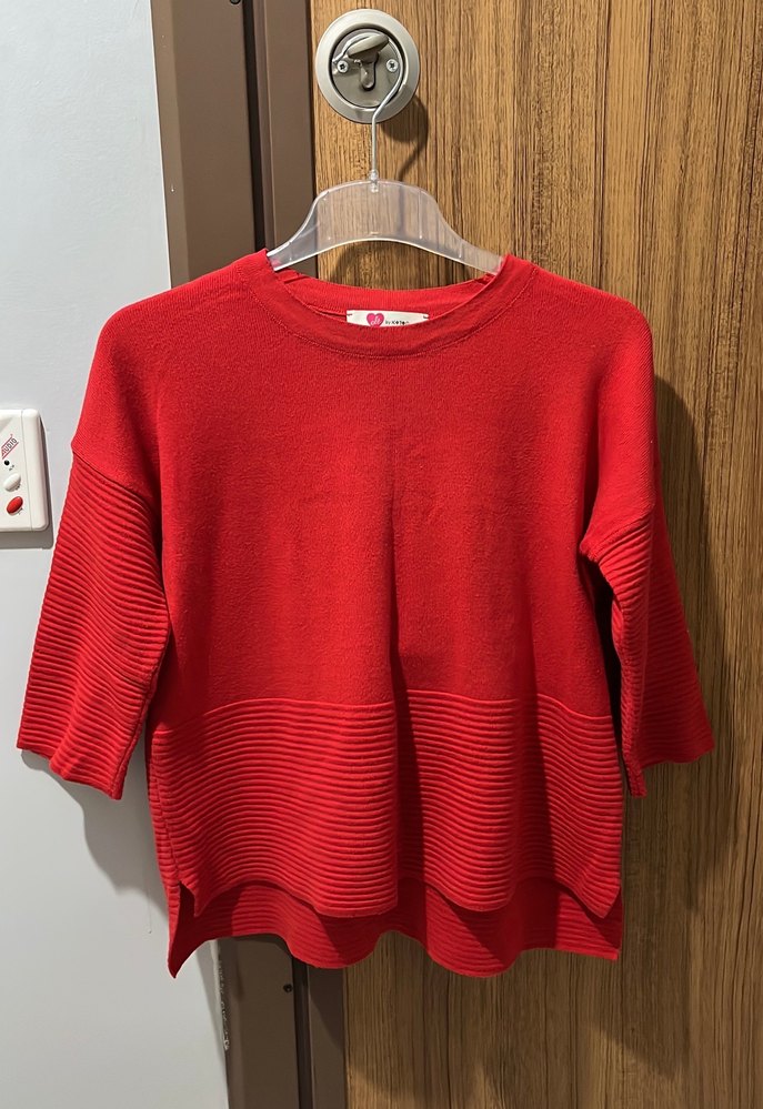 Kırmızı örgü yün kazak, yuvarlak yaka ve uzun kolludur. Rahat kesimi ve normal boyuyla gündelik kullanıma uygundur.