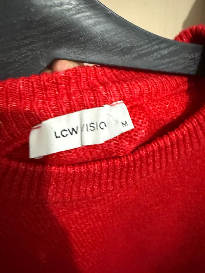 Kırmızı örgü yün kazak, uzun kollu ve bisiklet yaka tasarıma sahiptir. Salaş kesim ve midi boy uzunluğunda, rahat ve şık bir günlük kazak. Beden M.