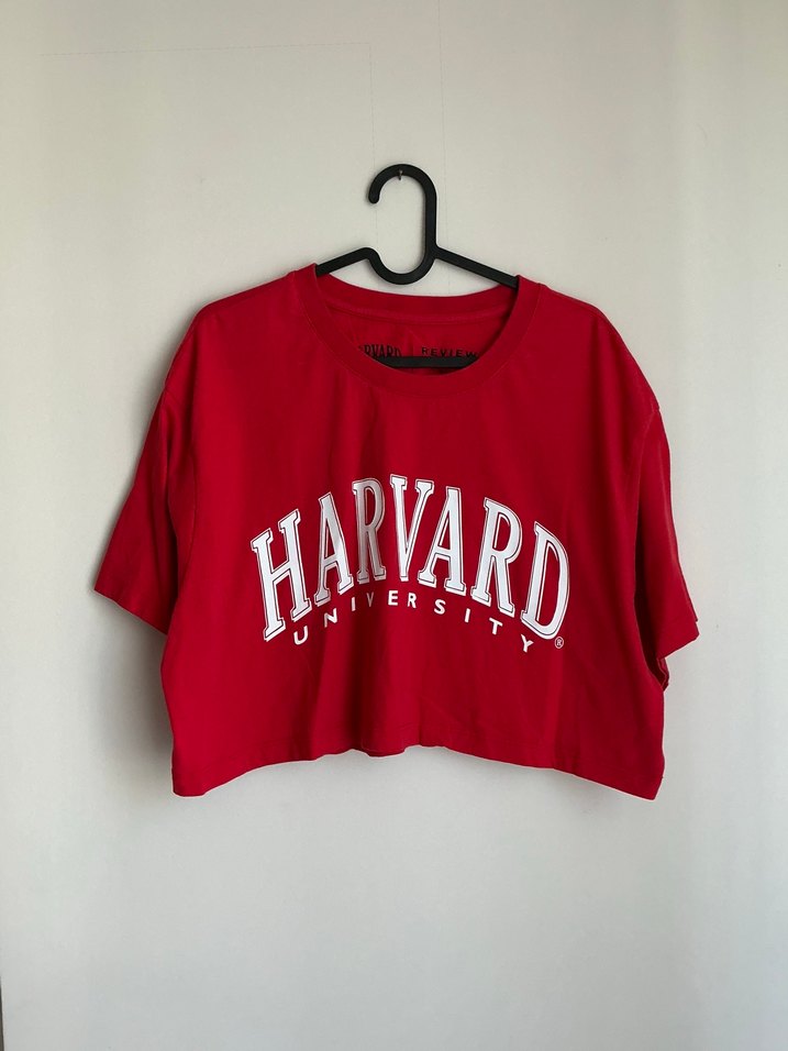 Yumuşak pamuktan, kısa kollu ve bol kesim kırmızı crop top. Parlak Harvard Üniversitesi baskılı, sportif ve rahat stil için uygun. Orijinal Üründür.
