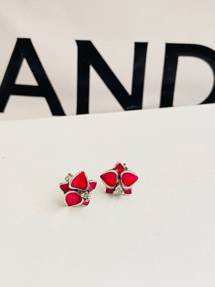 Kısa uzunlukta, kırmızı renkli, orkide çiçek desenli küpeler, cesur ve çağdaş bir tarz için uygundur.