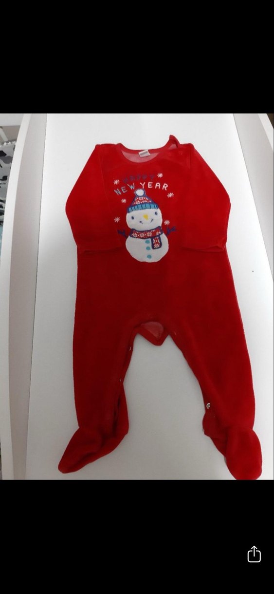 Kırmızı örme kumaştan yapılmış, renkli baskılı kar adam ve "NEW YEAR" yazısı bulunan bebek tulumu. Yumuşak ve sıcak tutar. ❄️