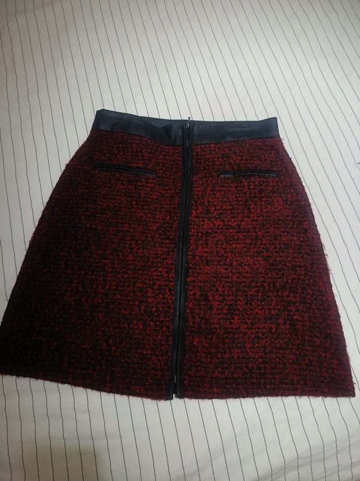Koyu kırmızı renkte, örme dokulu ve ön fermuarlı, fitted kesim midi kadın etek. İki küçük ön cepli ve düz bel bantlı, günlük modern kullanıma uygun.