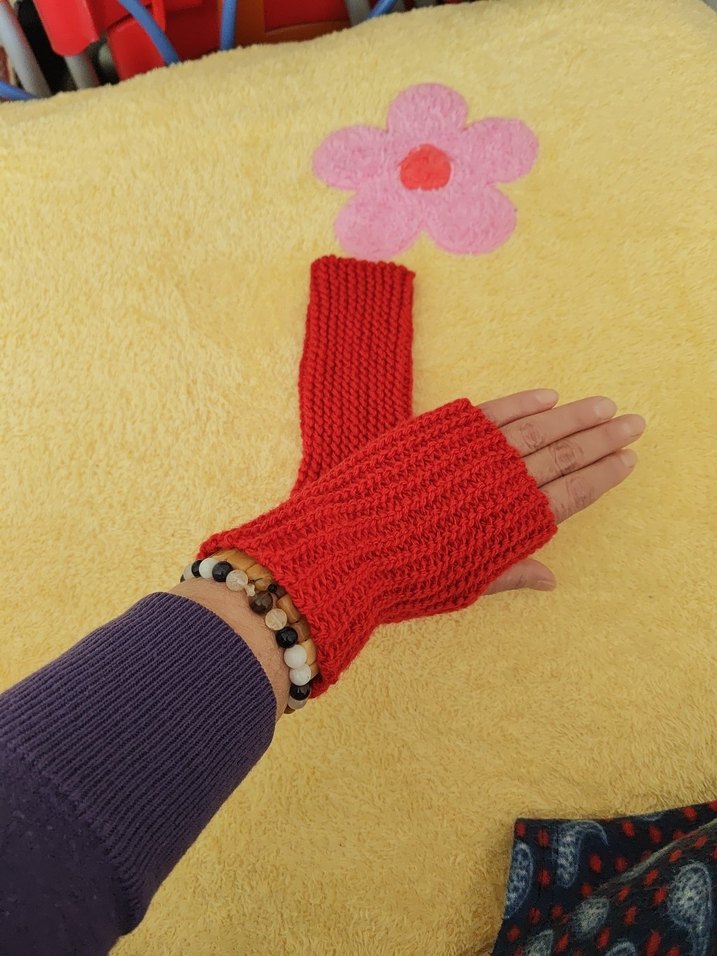 Kırmızı örme, parmakları açık kadın eldiveni. Rahat ve renkli yapısıyla bohem ve retro tarzlara uygundur.