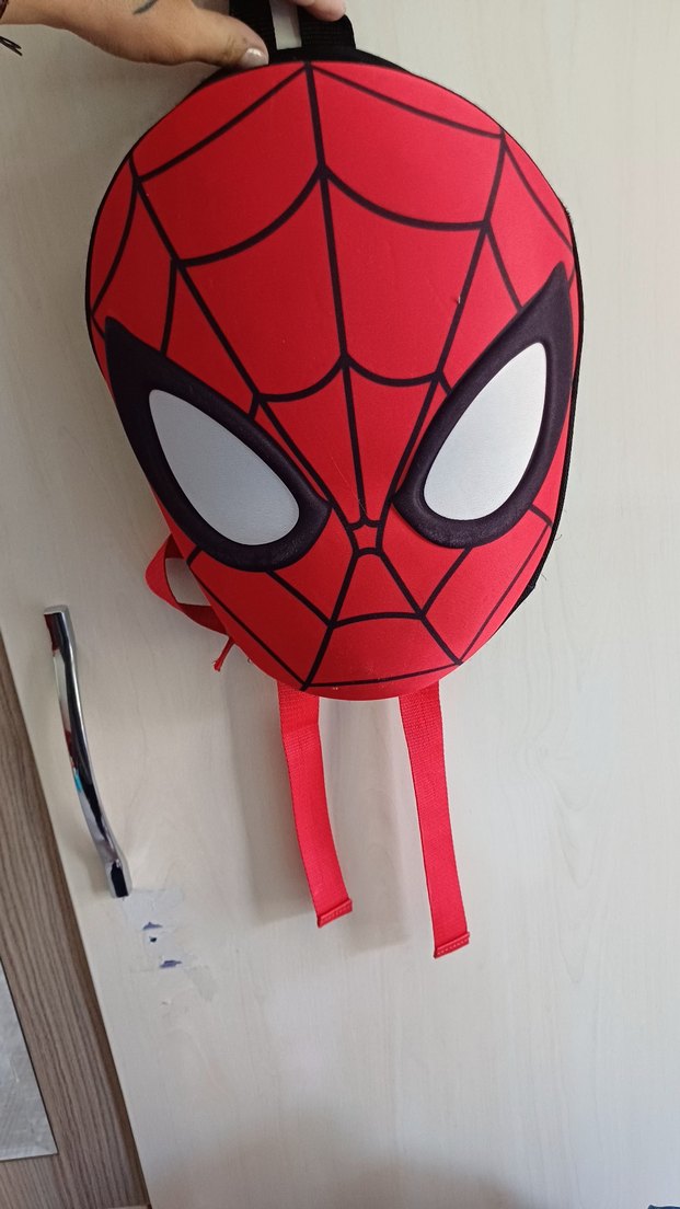 Kırmızı Örümcek Adam aksiyon figürü, renkli web desenleri ve büyük beyaz gözlerle detaylandırılmıştır. Taşıma için askıları vardır.️