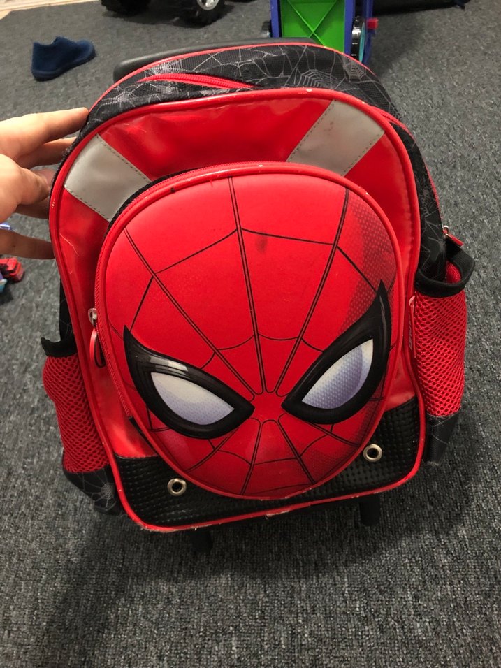 Koyu kırmızı renkte, ön cephesinde Örümcek Adam yüzü deseni ve yanlarda file cepler bulunan çocuk sırt çantası. ️