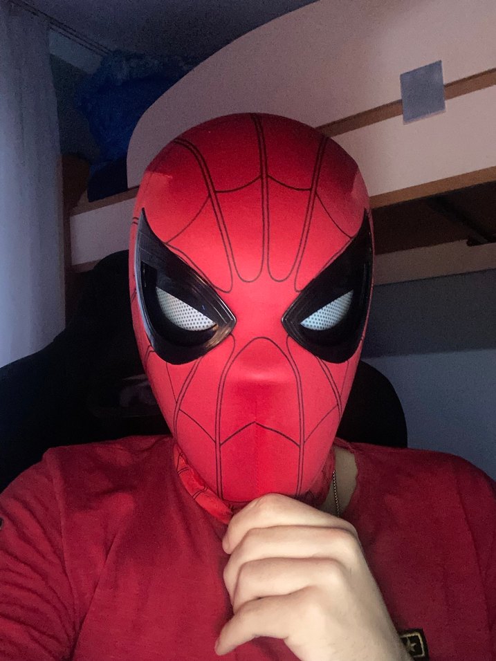 Gözleri kısılan mekanizmalı Örümcek Adam maskesi. Cosplay, çekim ve koleksiyon için ideal, sorunsuz.