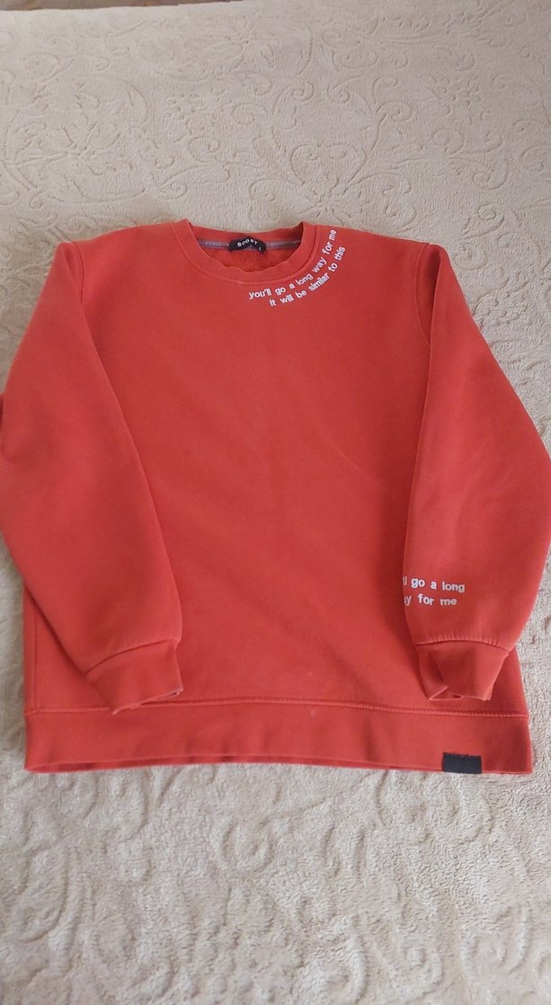 Kırmızı, yuvarlak yaka, uzun kollu, rahat kesim sweatshirt. Yumuşak tüylü kumaştan, normal midi boyda, sade ve yazılı detaylı, gündelik ve sportif tarz için uygun.ufak lekesi var uzaktan belli olmiyor