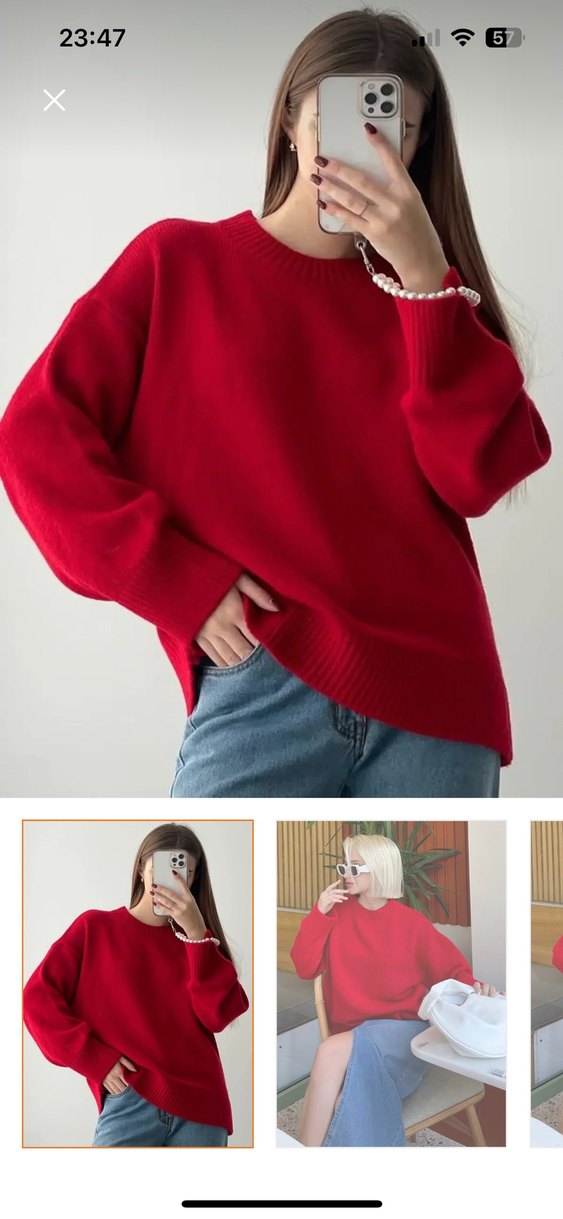 Kırmızı renk, yuvarlak yaka ve uzun kollu, yumuşak triko kumaştan yapılmış bol kesim kadın kazak. Günlük kullanım için zahmetsiz şıklık sunar.
