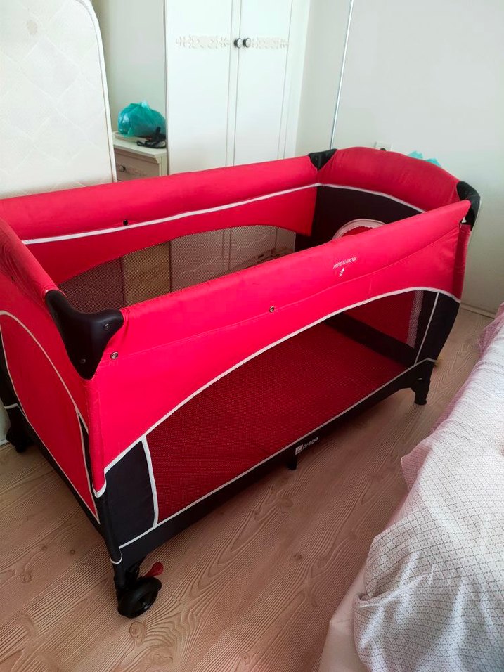 Renkli kırmızı oyun parkı beşiği, file yanları ve kolay hareket için tekerlekleri vardır. Bebekler için güvenli ve rahat bir alan sağları. Arakatı, alt değiştirme aparatı ıslak mendil, sallanma aparatları ve dönencesi mevcuttur.