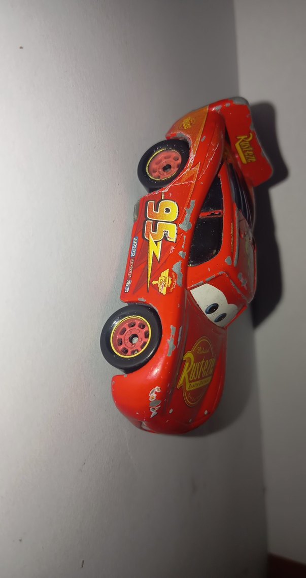 Kırmızı renkli, renkli detaylara sahip Lightning McQueen temalı oyuncak araba. Oynanmış, çizikler mevcut.