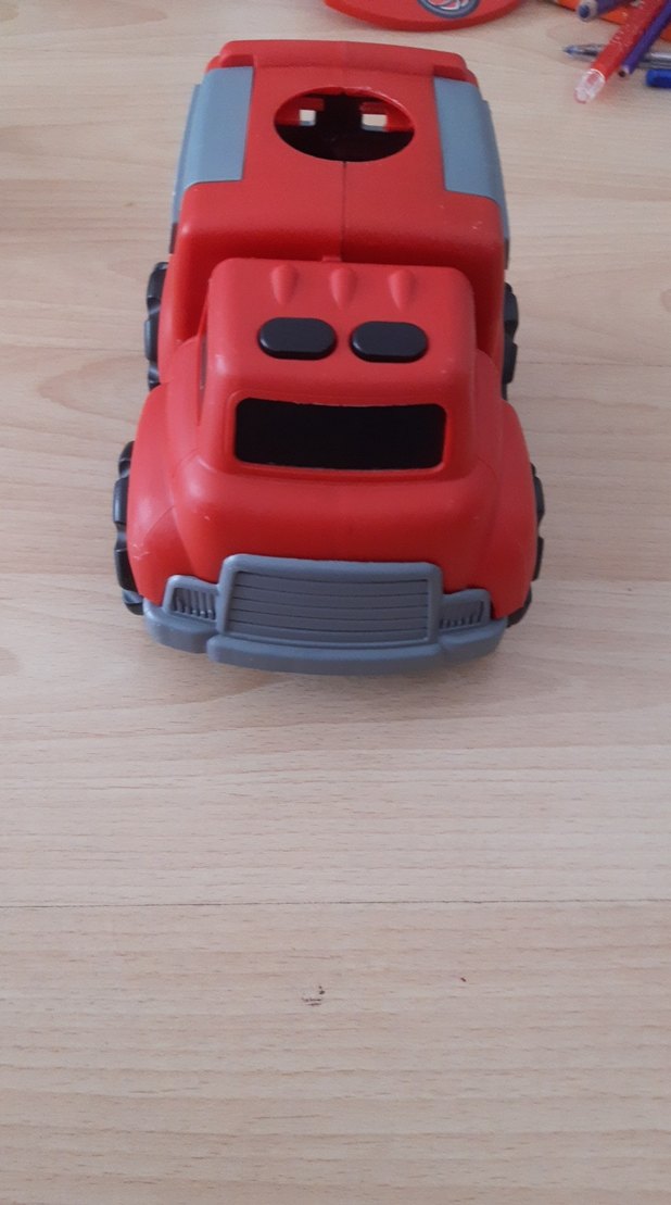 Kırmızı ve gri plastik gövdesi ile detaylı tekerleklere sahip renkli oyuncak kamyon.