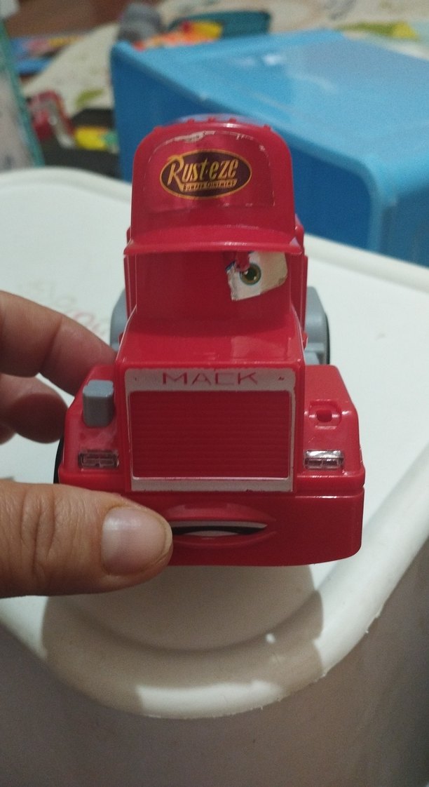 Canlı kırmızı renkte, detaylı ön tasarıma ve ifadeli gözlere sahip oyuncak kamyon.
