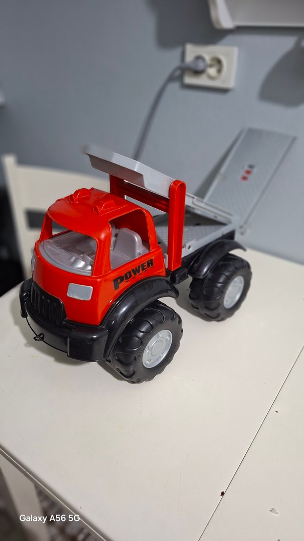 Kırmızı renkli, büyük tekerlekli ve kaldırılabilir arka kısmı olan oyuncak kamyon. Araç oyuncaklarını seven çocuklar için uygundur. dayanıklıdır kırığı yok