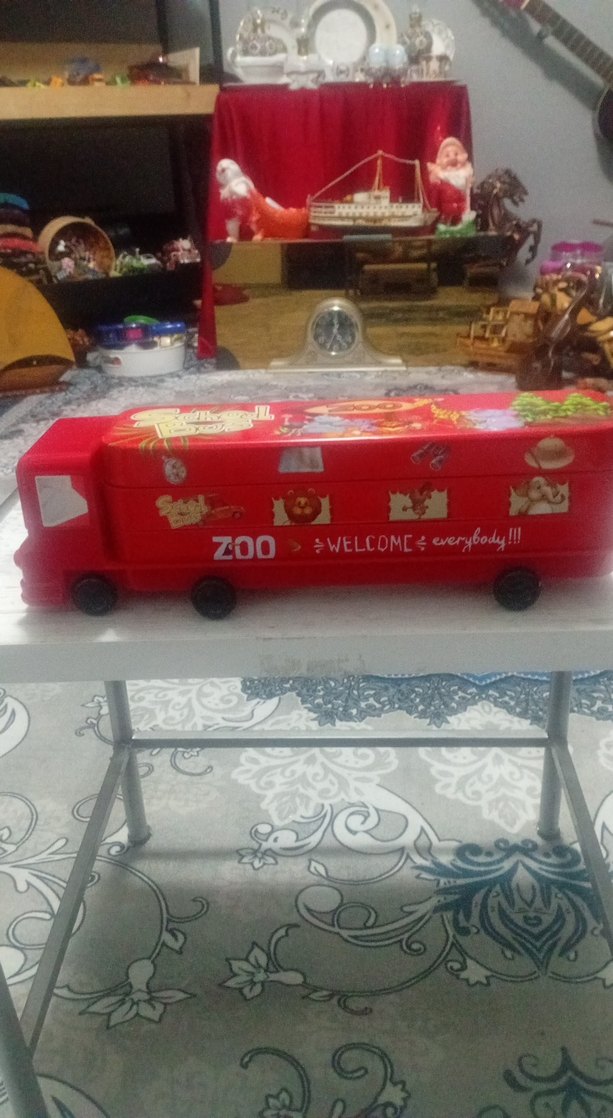 Renkli hayvanat bahçesi temalı süslemelere ve "ZOO WELCOME everybody!!!" yazısına sahip kırmızı oyuncak kamyonet.