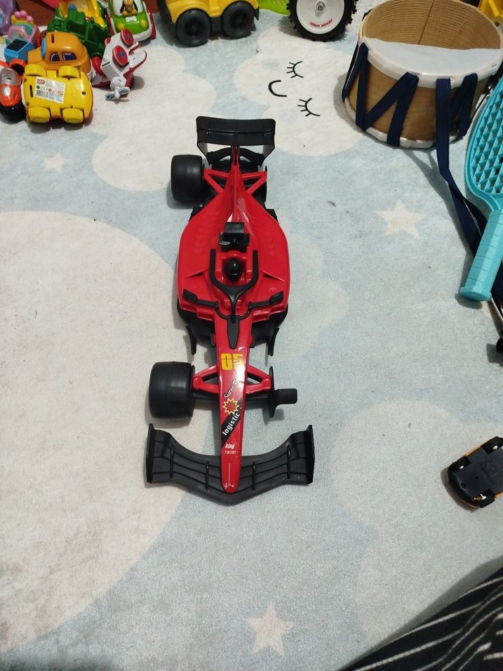 Koyu kırmızı renkte oyuncak yarış arabası, detaylı tasarıma ve büyük tekerleklere sahiptir. ️iki tekerleği yok