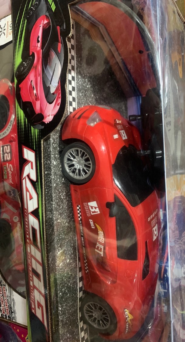 Yarış çizgileri ve detaylı tekerlekleri olan renkli kırmızı oyuncak araba, oyun ve koleksiyon için uygundur.