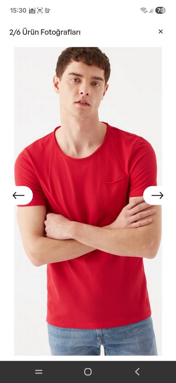 Pamuklu kırmızı erkek tişört, bisiklet yaka ve kısa kollu. Parlak dokusu ve küçük cep detayıyla gündelik sokak stili için uygun.