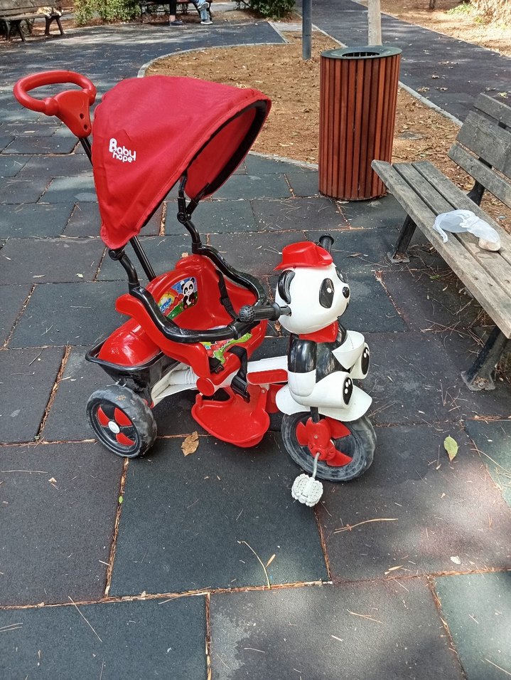 Kırmızı renkte, panda figürlü çocuk üç tekerlekli bisiklet. Gölgelik tente, güvenlik korkuluğu ve pedalları bulunur.