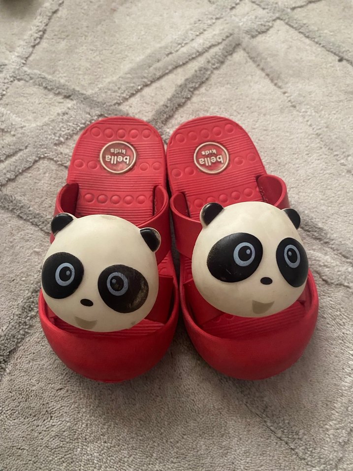 kırmızı kauçuk terlikler ve sevimli panda figürleri ile renkli sokak stili havasında. İki pandaya basında ses çıkıyor kızıma küçük geldiği için satıyorum 24 numaraya uygun
