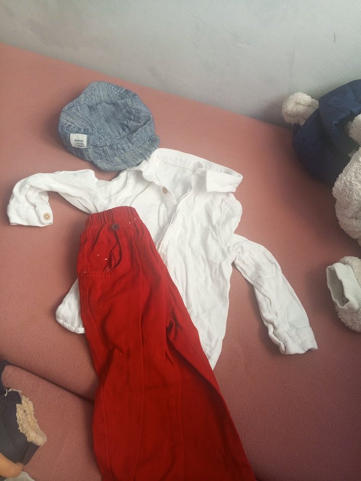 Beyaz uzun kollu, yakalı gömlek ile canlı kırmızı keten pantolon ve gri şapka içeren bebek erkek kıyafet seti.
