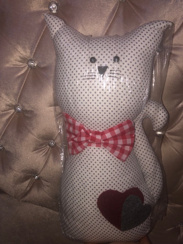 Kırmızı kareli papyonlu, gri puantiyeli peluş kedi oyuncak. Nakışlı yüz detayları ve kalp şekilli yamalar bulunur. 30 cmdir