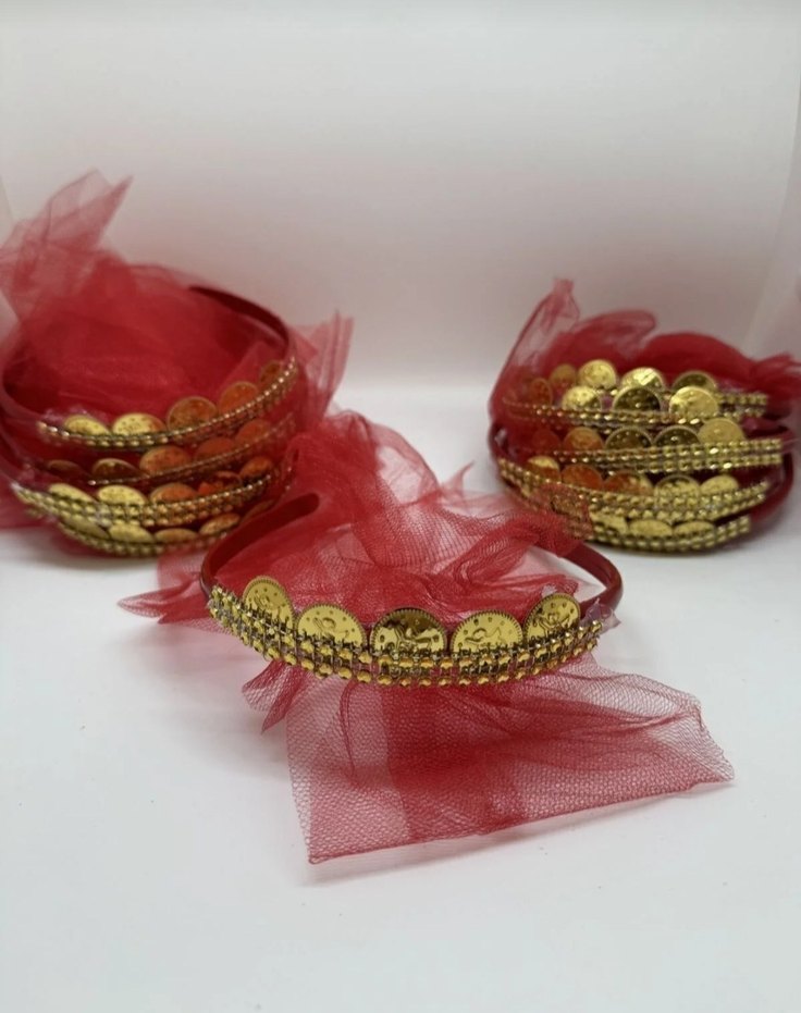 Altın renkli, payetli plastik detaylara ve kırmızı tül kumaşa sahip kadın saç aksesuarı. ✨