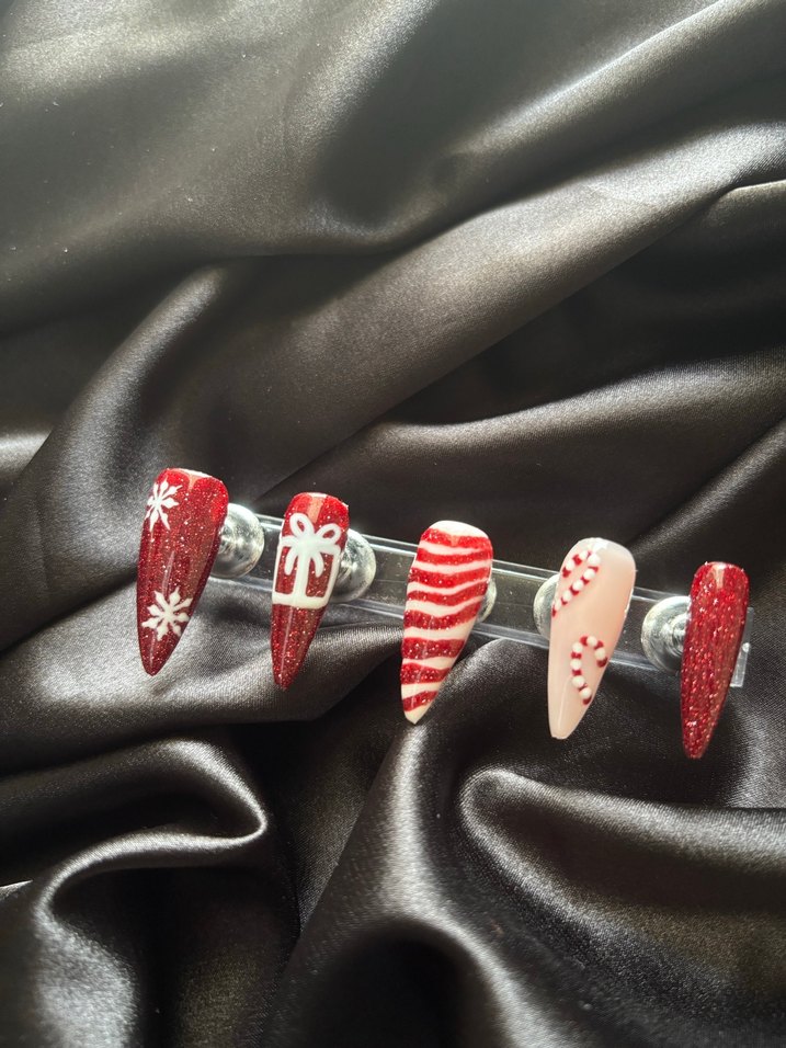 Koyu kırmızı parıltılı yılbaşı temalı tırnak süsleri, kar tanesi, hediye kurdelesi, şeker kamışı ve çizgili desenlerle süslenmiştir. Yeni nesil tips üzerine jel uygulanarak kalıcı oje ile renklendirilmiştir. Ölçülerinize özel olarak hazırlanacaktır. Paket içerisinde portakal çubuğu ve mini törpü mevcuttur. Yeni ilan açtırınız