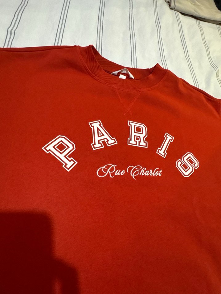 Kırmızı renkte, uzun kollu ve bisiklet yaka kadın sweatshirt. Önde Paris baskısı ve rahat, yumuşak dokulu kumaştan üretilmiştir. Günlük şıklık için ideal.