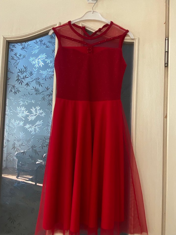 Bu kırmızı parlak elbise, straplez yaka ve drapeli tasarıma sahiptir. Kolsuz ve fitted kesimdir, gotik tarz için uygundur. 8 yaş için